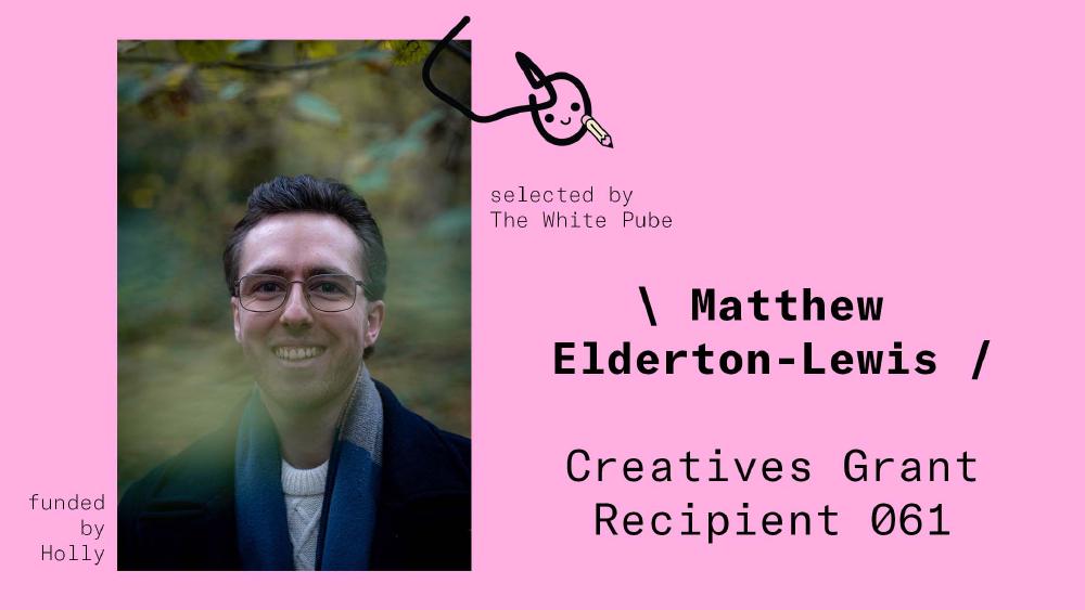 The 61st recipient of the White Pube Creatives Grant is … Matthew Elderton-Lewis! Matthew is a composer from Essex. We were enthused by the way Matthew’s work seems to exist in this medium of SOUND, as an abstract conceptual vehicle, as a material, as a way of exploring feeling and questions and tensions and things that maybe can’t find a way to be expressed neatly in language. Sound comes in to fill the gap. Matthew’s practice feels like this valuable thing, a conduit, a container. We are very pleased to be able to support his work in this way, and we hope this grant will be the first of many for him.